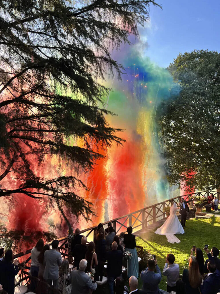 Kültéri esküvő vidéken, pár vendégek előtt, színes füst a háttérben.